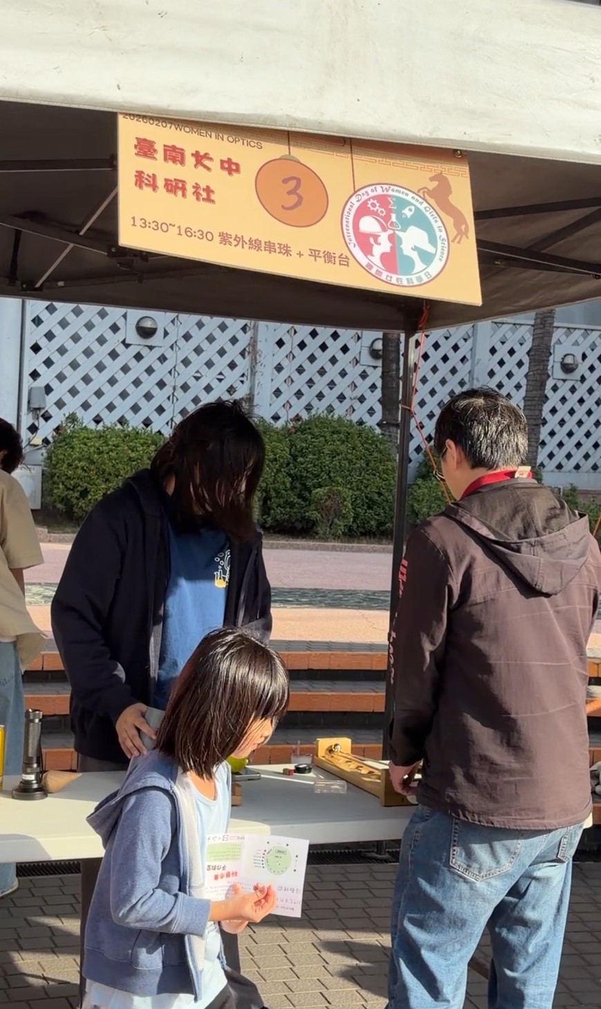 2026年2月7日(六) 下午,為響應聯合國訂定每年2月11日為「國際女性科學日(International Day of Women and Girls in Science)」,我們於台南大遠百成功店前廣場舉辦「Women in Science 女性科學日快閃」活動!本次由SPIE國際光電工程學會成大學生分會與成大科教中心合作,辦理女性科學日快閃,並集結台南女中天文社、台南女中科學研究社一起參與,內容不僅有運用光學原理的好玩教具、科學桌遊的體驗、還有太陽黑子的觀測。