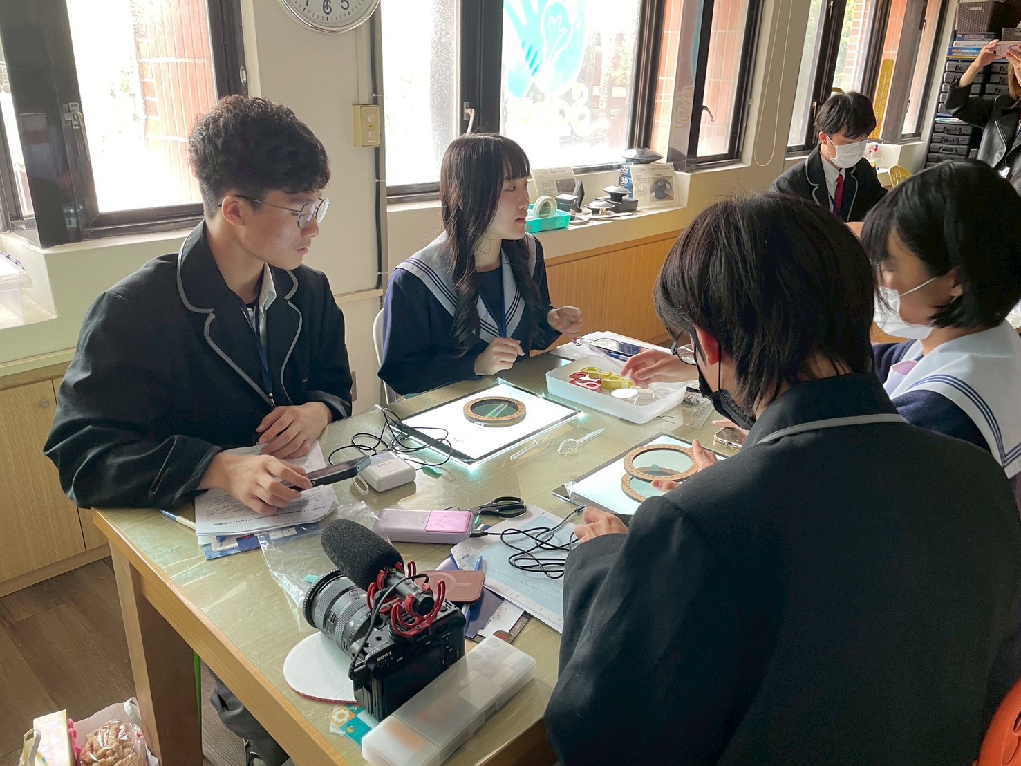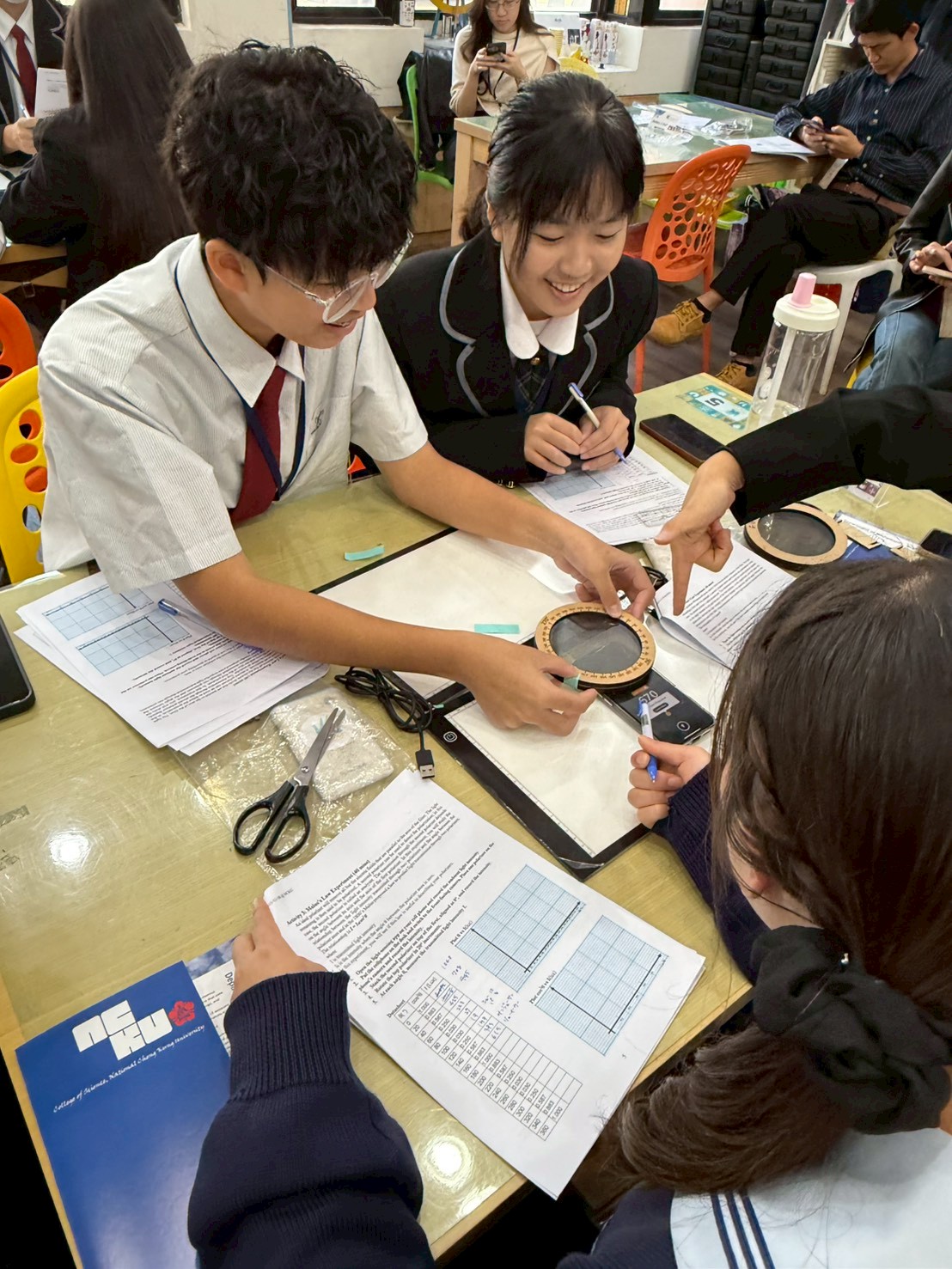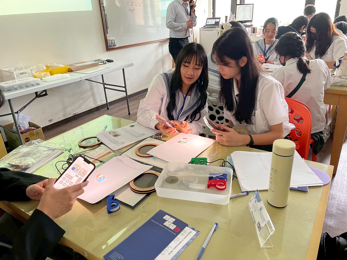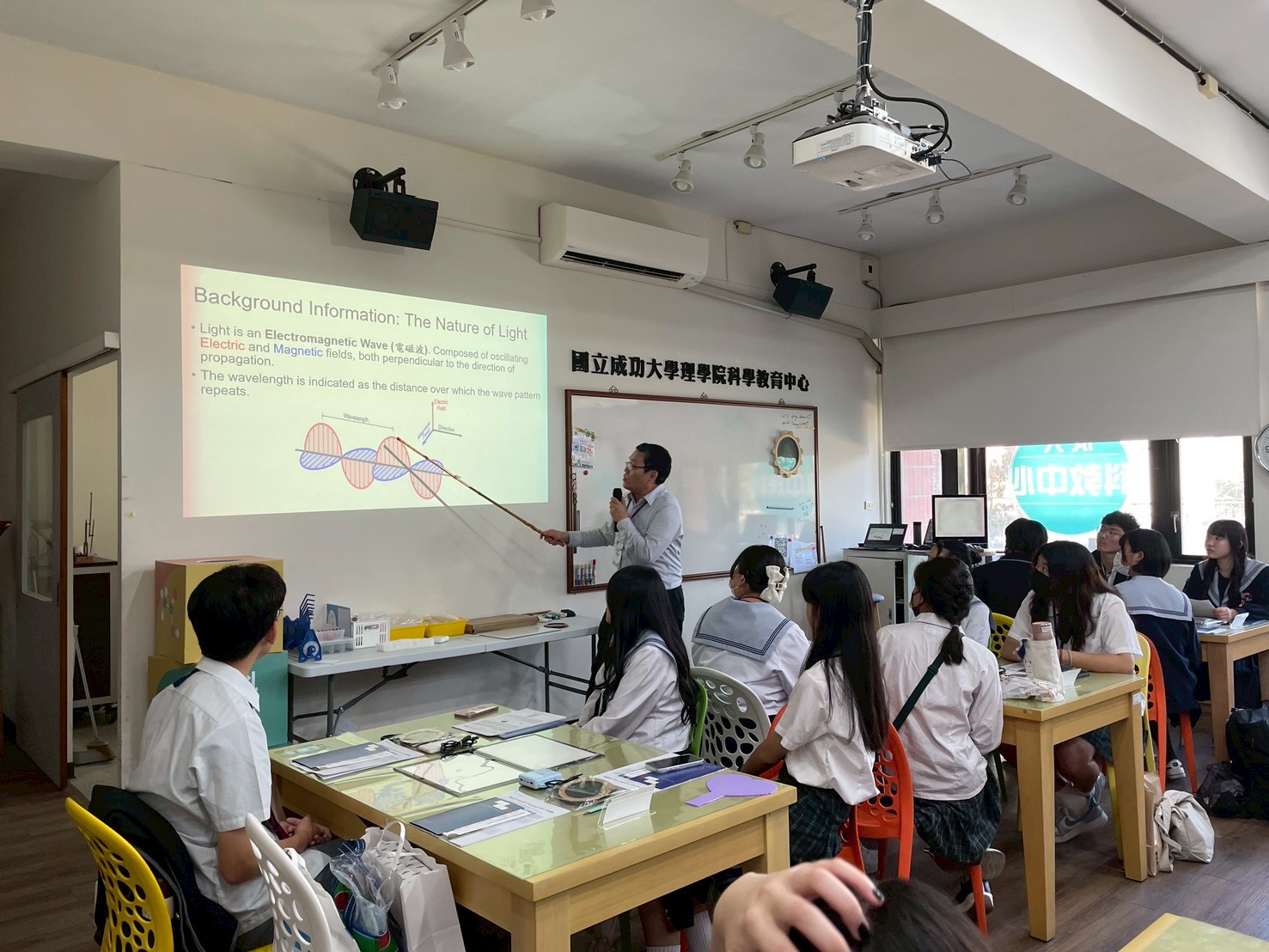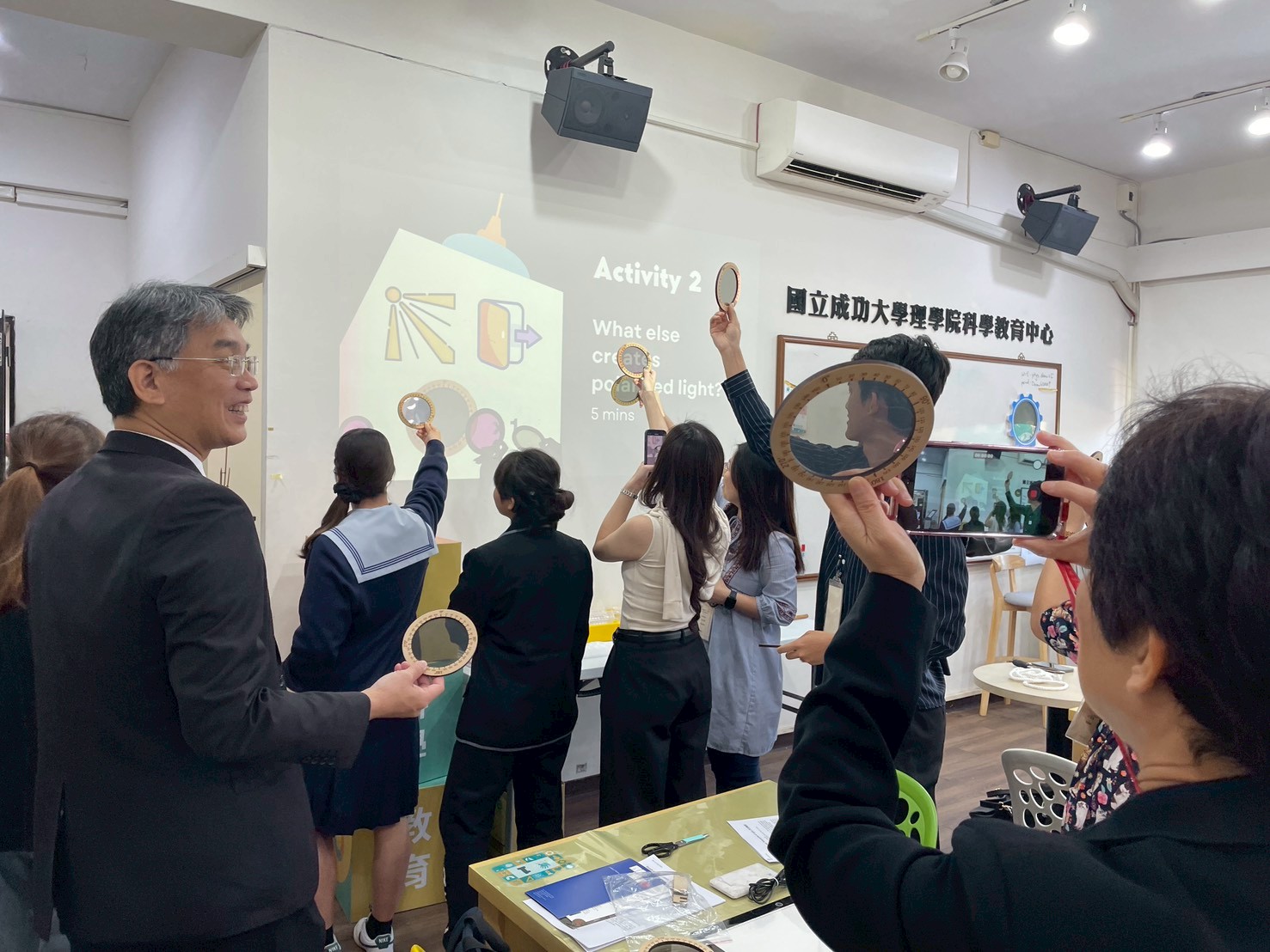 來自南科實中與日本上野高校的師生齊聚一堂,在成大科教中心參加一場妙趣橫生的跨國科學交流活動。大家不僅探索了神秘的宇宙射線,還體驗偏振以及透光片,及光的折射等反應
