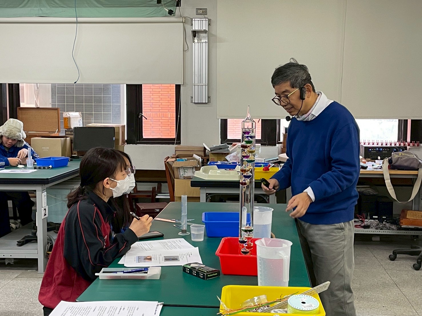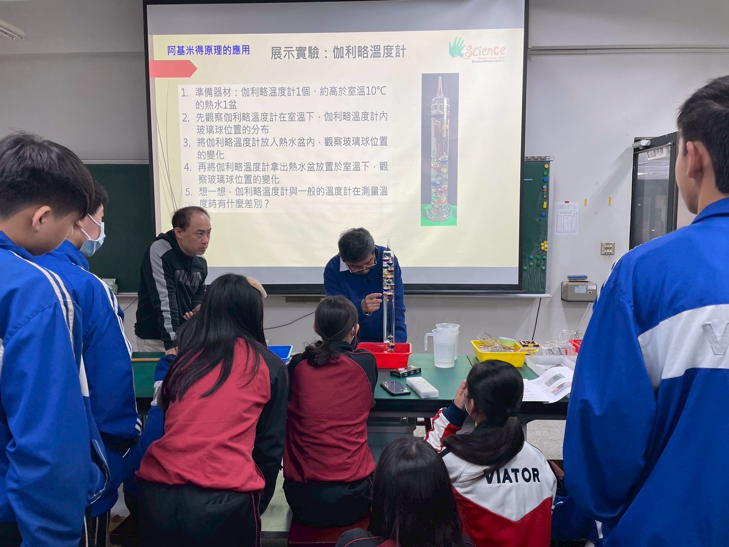 由許瑞榮教授主講阿基米得原理的應用,從伽利略溫度計到測量硬幣體積,讓同學們在實驗中觀察溫度與體積的變化。此外,衛道中學也參訪了位於新興國中的密室,體驗多元有趣的學習空間。