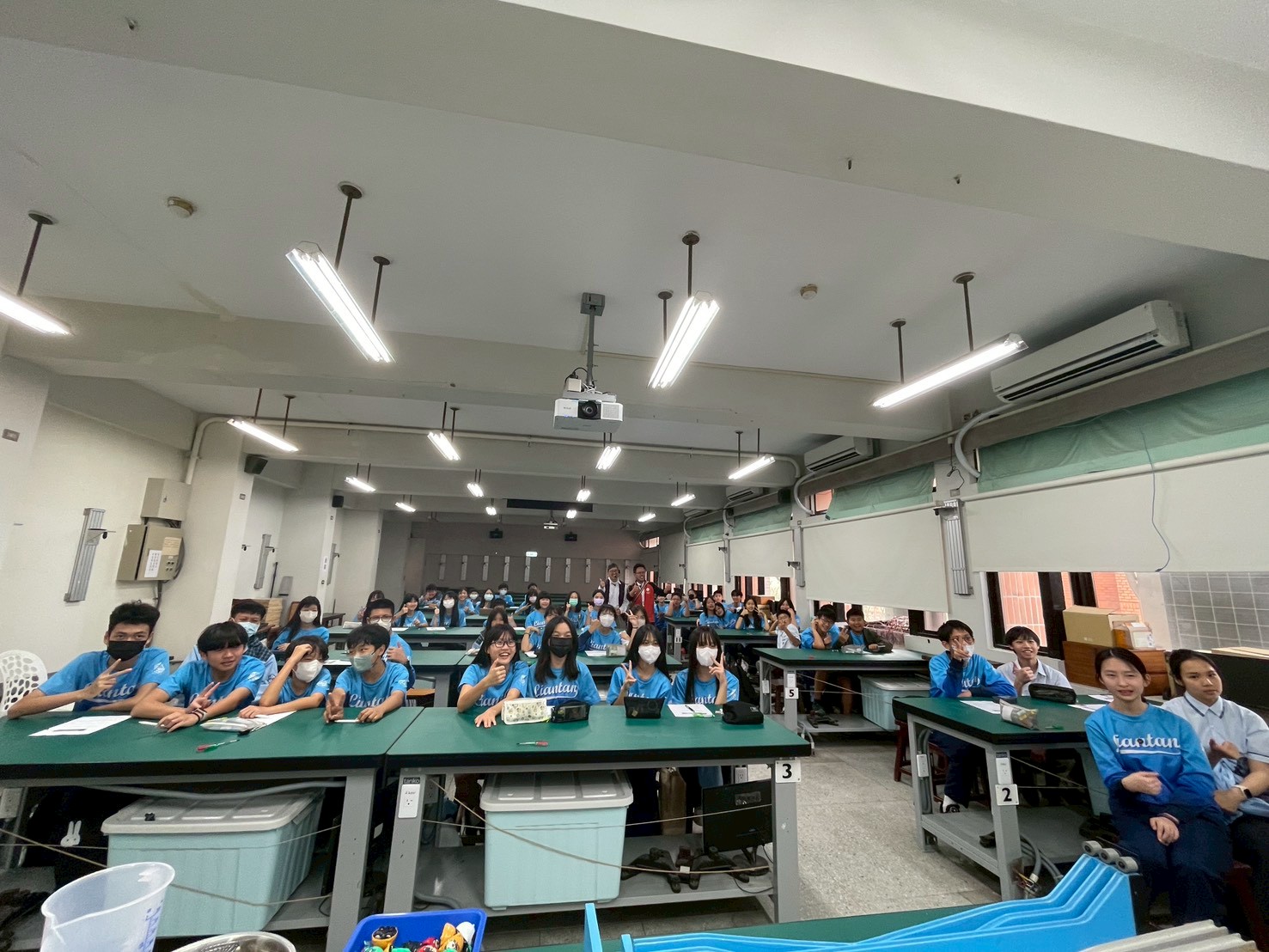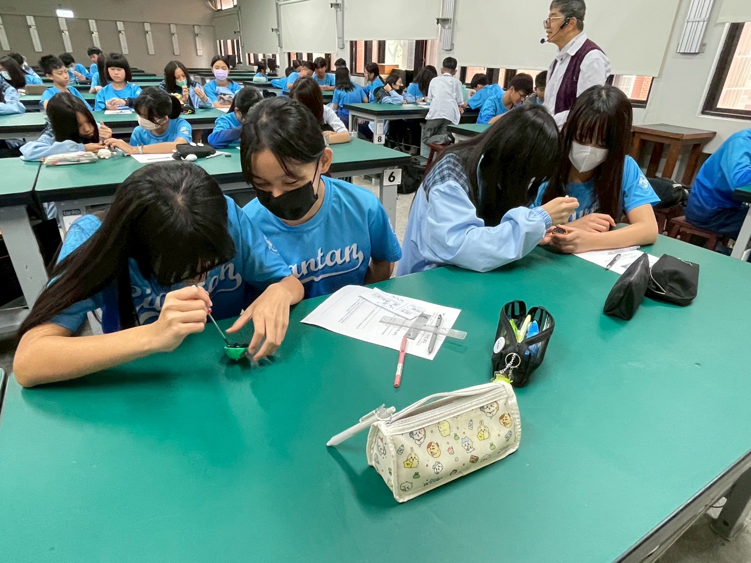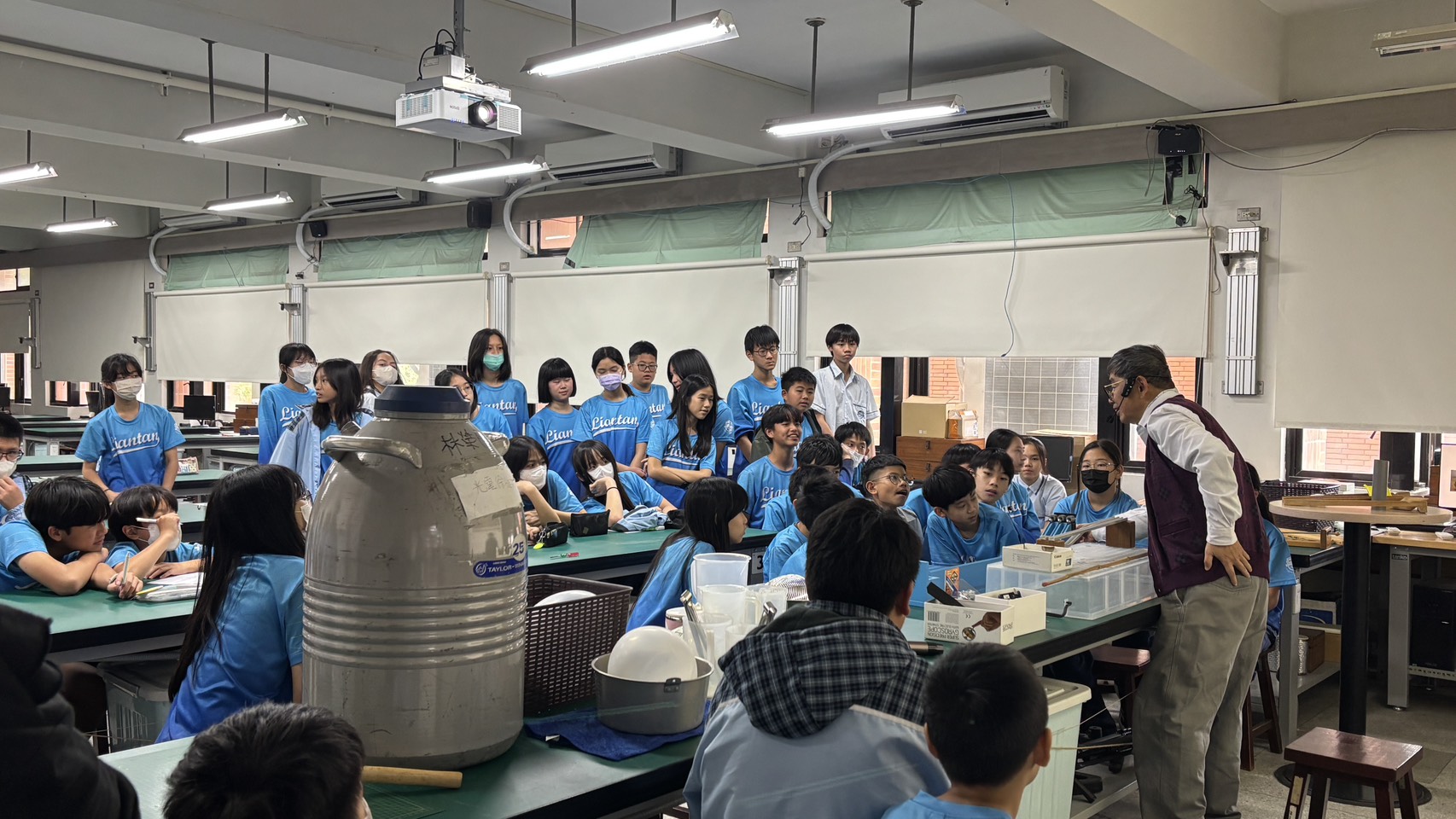 許瑞榮教授帶領同學們進行液態氮、雙珠競走、錐體上滾、陀螺車等實驗。
